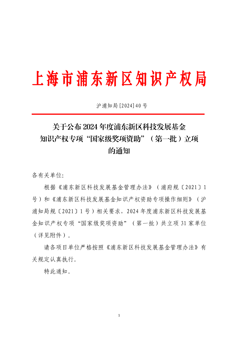 根据《浦东新区科技发展基金管理办法》(浦府规〔2021〕1号)和《浦东新区科技发展基金知识产权资助专项操作细则》(沪浦知局规〔2021〕1号)相关要求,2024年度浦东新区科技发展基金知识产权专项“国家级奖项资助”(第一批)共立项31家单位(详见附件)。