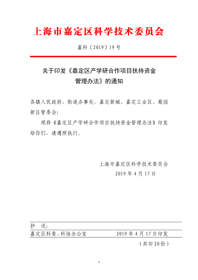 关于印发《嘉定区产学研合作项目扶持资金管理办法》的通知