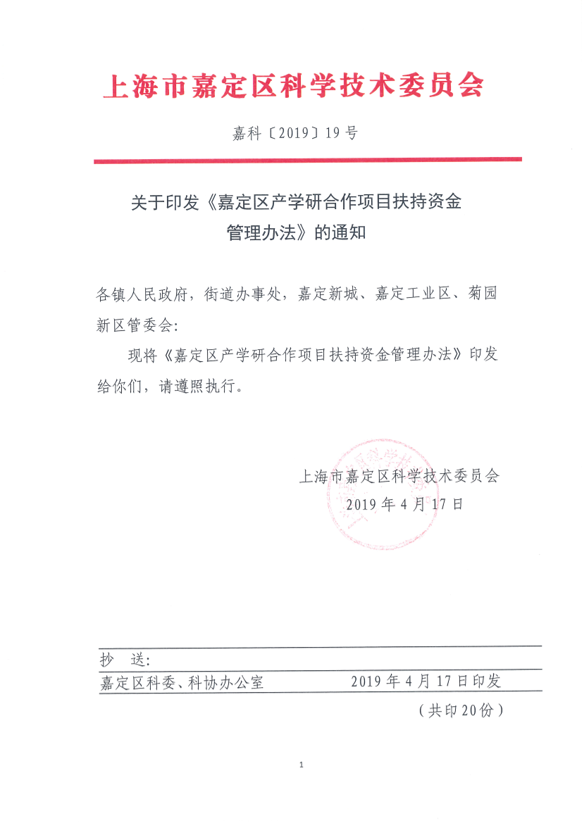 关于印发《嘉定区产学研合作项目扶持资金管理办法》的通知