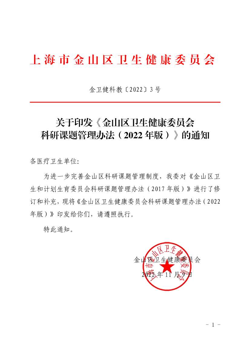 为进一步完善金山区科研课题管理制度,我委对《金山区卫生和计划生育委员会科研课题管理办法(2017年版)》进行了修订和补充,现将《金山区卫生健康委员会科研课题管理办法(2022年版)》印发给你们,请遵照执行。