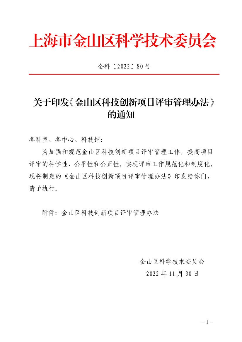 为加强和规范金山区科技创新项目评审管理工作,提高项目评审的科学性、公平性和公正性,实现评审工作规范化和制度化,现将制定的《金山区科技创新项目评审管理办法》印发给你们,请予执行。