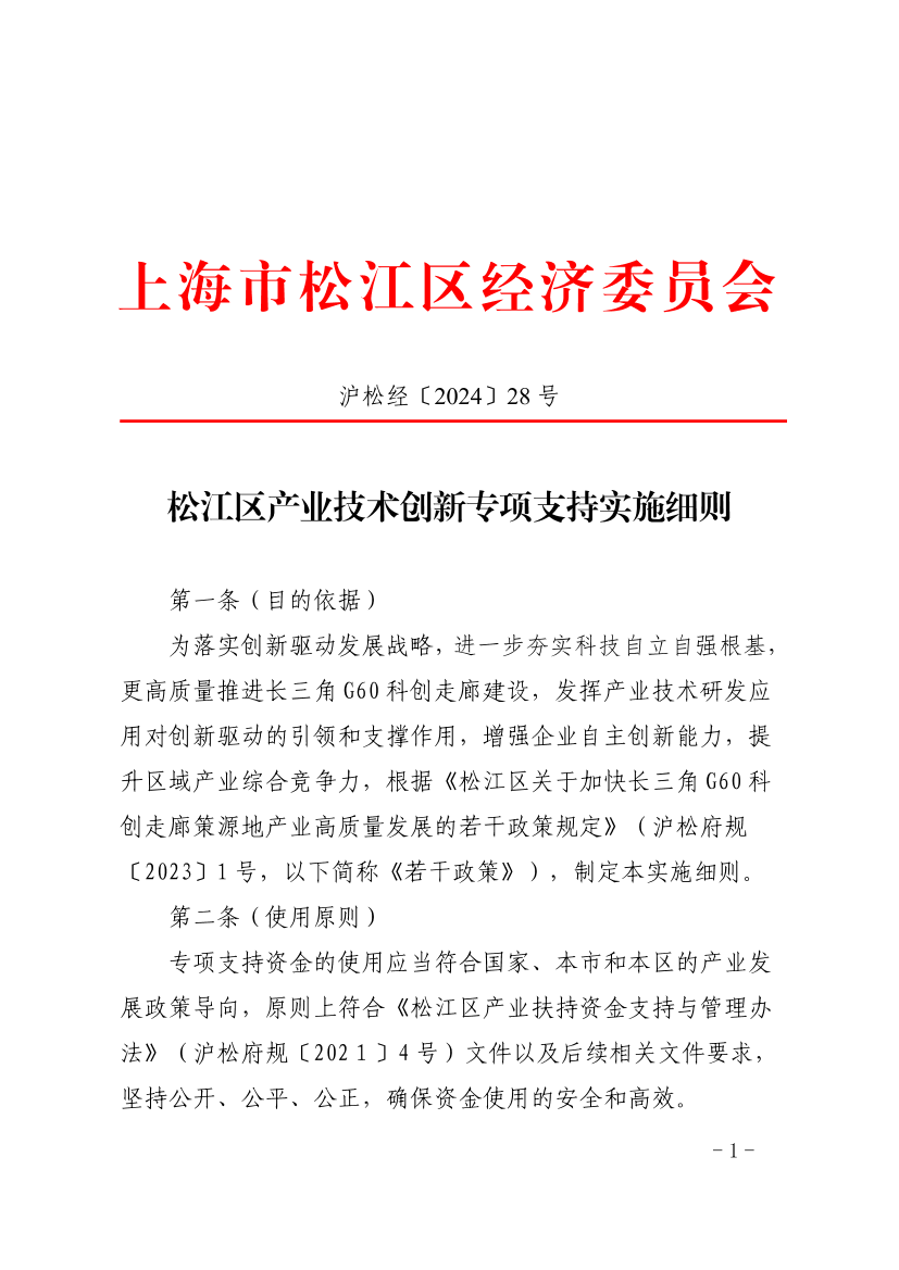 为落实创新驱动发展战略,进一步夯实科技自立自强根基,更高质量推进长三角G60科创走廊建设,发挥产业技术研发应用对创新驱动的引领和支撑作用,增强企业自主创新能力,提升区域产业综合竞争力,根据《松江区关于加快长三角G60科创走廊策源地产业高质量发展的若干政策规定》(沪松府规〔2023〕1号,以下简称《若干政策》),制定本实施细则。