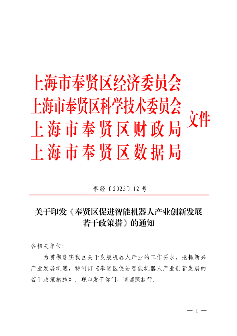 奉贤区促进智能机器人产业创新发展若干政策措施