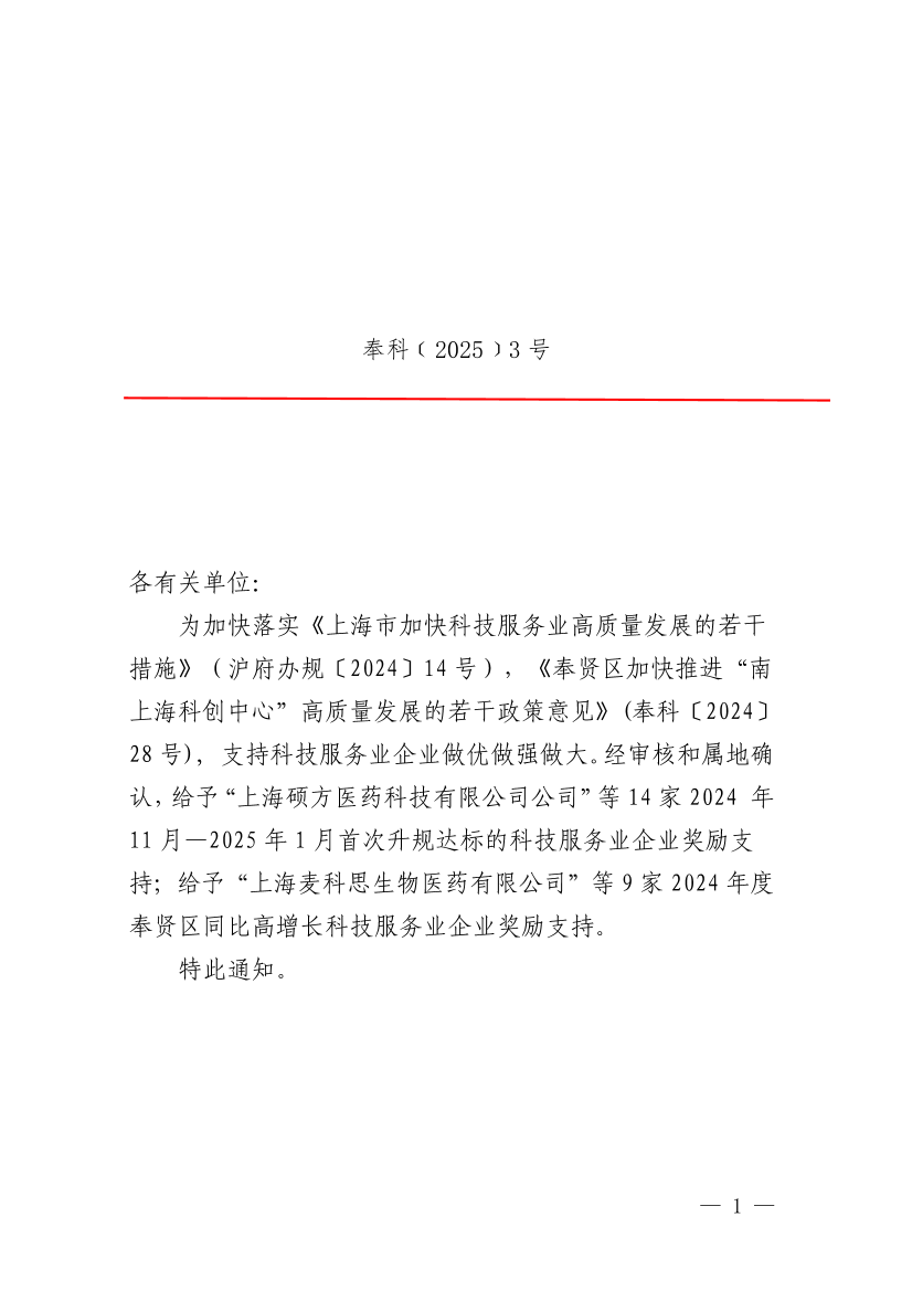 为加快落实《上海市加快科技服务业高质量发展的若干措施》(沪府办规〔2024〕14号),《奉贤区加快推进“南上海科创中心”高质量发展的若干政策意见》(奉科〔2024〕28号), 支持科技服务业企业做优做强做大。经审核和属地确认,给予“上海硕方医药科技有限公司公司”等14家2024 年11月—2025年1月首次升规达标的科技服务业企业奖励支持;给予“上海麦科思生物医药有限公司”等9家2024年度奉贤区同比高增长科技服务业企业奖励支持。