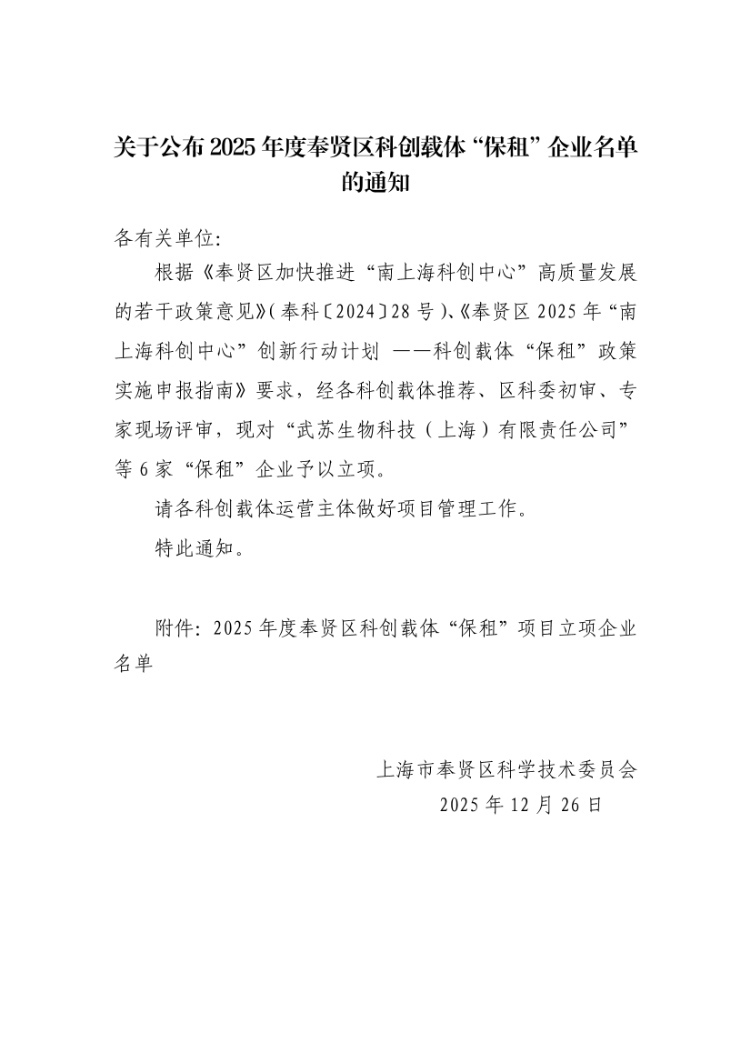 根据《奉贤区加快推进“南上海科创中心”高质量发展的若干政策意见》(奉科〔2024〕28号)、《奉贤区2025年“南上海科创中心”创新行动计划 ——科创载体“保租”政策实施申报指南》要求,经各科创载体推荐、区科委初审、专家现场评审,现对“武苏生物科技(上海)有限责任公司”等6家“保租”企业予以立项。