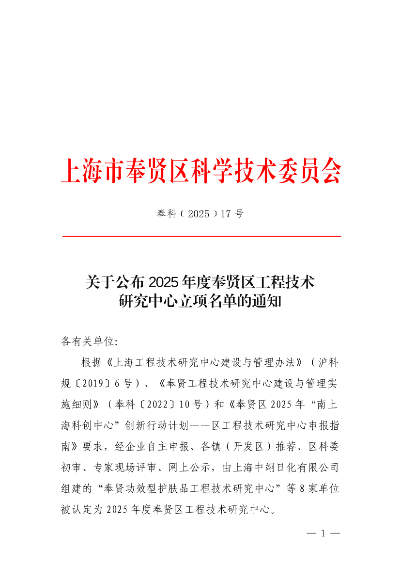 根据《上海工程技术研究中心建设与管理办法》(沪科规〔2019〕6号)、《奉贤工程技术研究中心建设与管理实施细则》(奉科〔2022〕10号)和《奉贤区2025年“南上海科创中心”创新行动计划——区工程技术研究中心申报指南》要求,经企业自主申报、各镇(开发区)推荐、区科委初审、专家现场评审、网上公示,由上海中翊日化有限公司组建的“奉贤功效型护肤品工程技术研究中心”等8家单位被认定为2025年度奉贤区工程技术研究中心。