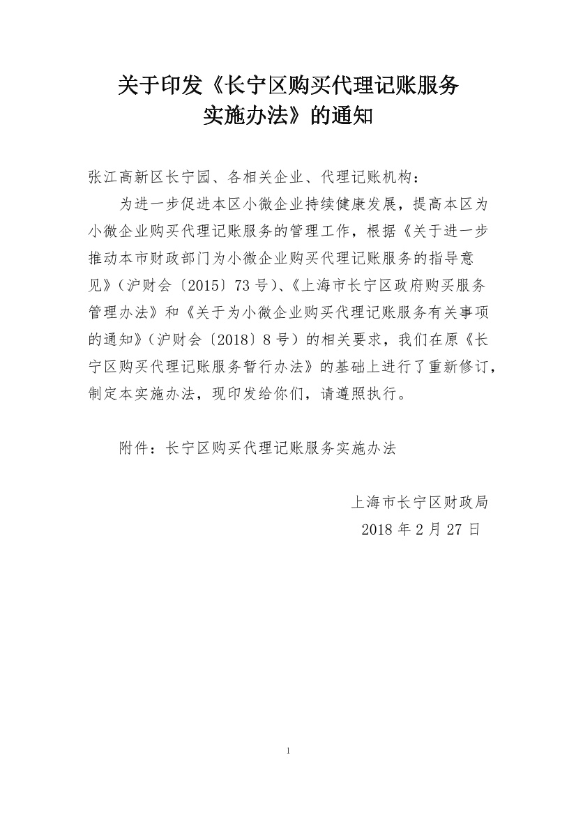 为进一步促进本区小微企业持续健康发展,提高本区为小微企业购买代理记账服务的管理工作,根据《关于进一步推动本市财政部门为小微企业购买代理记账服务的指导意见》(沪财会〔2015〕73号)、《上海市长宁区政府购买服务管理办法》和《关于为小微企业购买代理记账服务有关事项的通知》(沪财会〔2018〕8号)的相关要求,我们在原《长宁区购买代理记账服务暂行办法》的基础上进行了重新修订,制定本实施办法,现印发给你们,请遵照执行。
