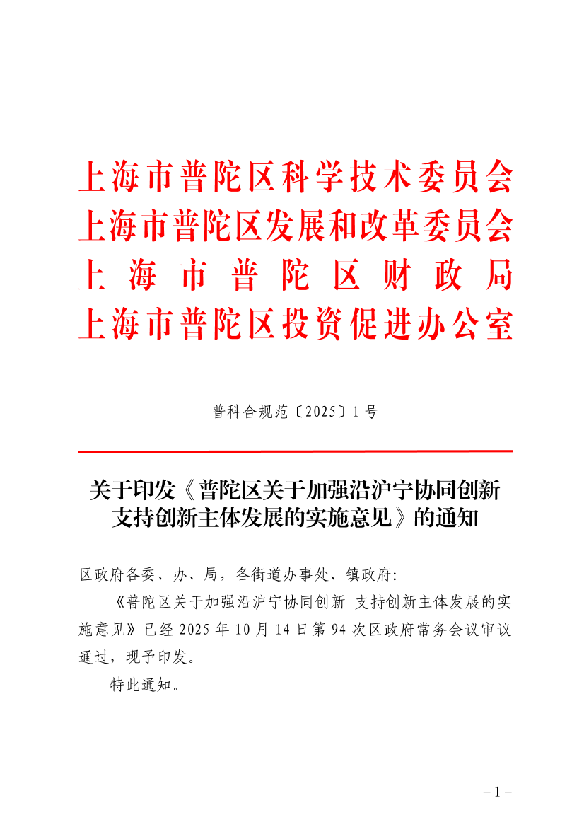 《普陀区关于加强沿沪宁协同创新 支持创新主体发展的实施意见》已经2025年10月14日第94次区政府常务会议审议通过,现予印发。