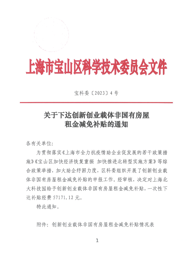 为贯彻落实《上海市全力抗疫情助企业促发展的若干政策措施》《宝山区加快经济恢复重振 加快推进北转型实施方案》等综合政策举措,加大助企纾困力度,区科委组织开展了创新创业载体非国有房屋租金减免补贴的申报工作。经审核,决定对上海北大科技园给予创新创业载体非国有房屋租金减免补贴,一次性下达补贴经费57171.12元。