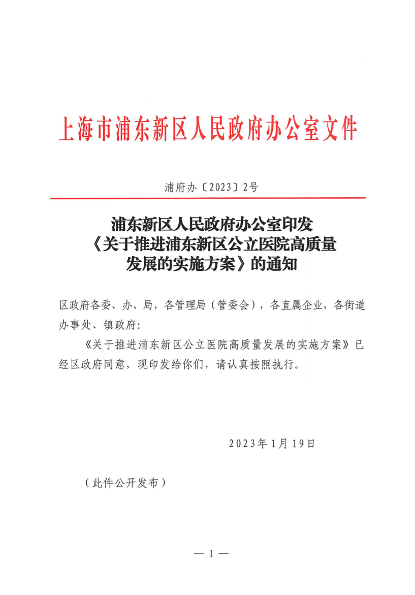 浦东新区人民政府办公室印发《关于推进浦东新区公立医院高质量发展的实施方案》的通知