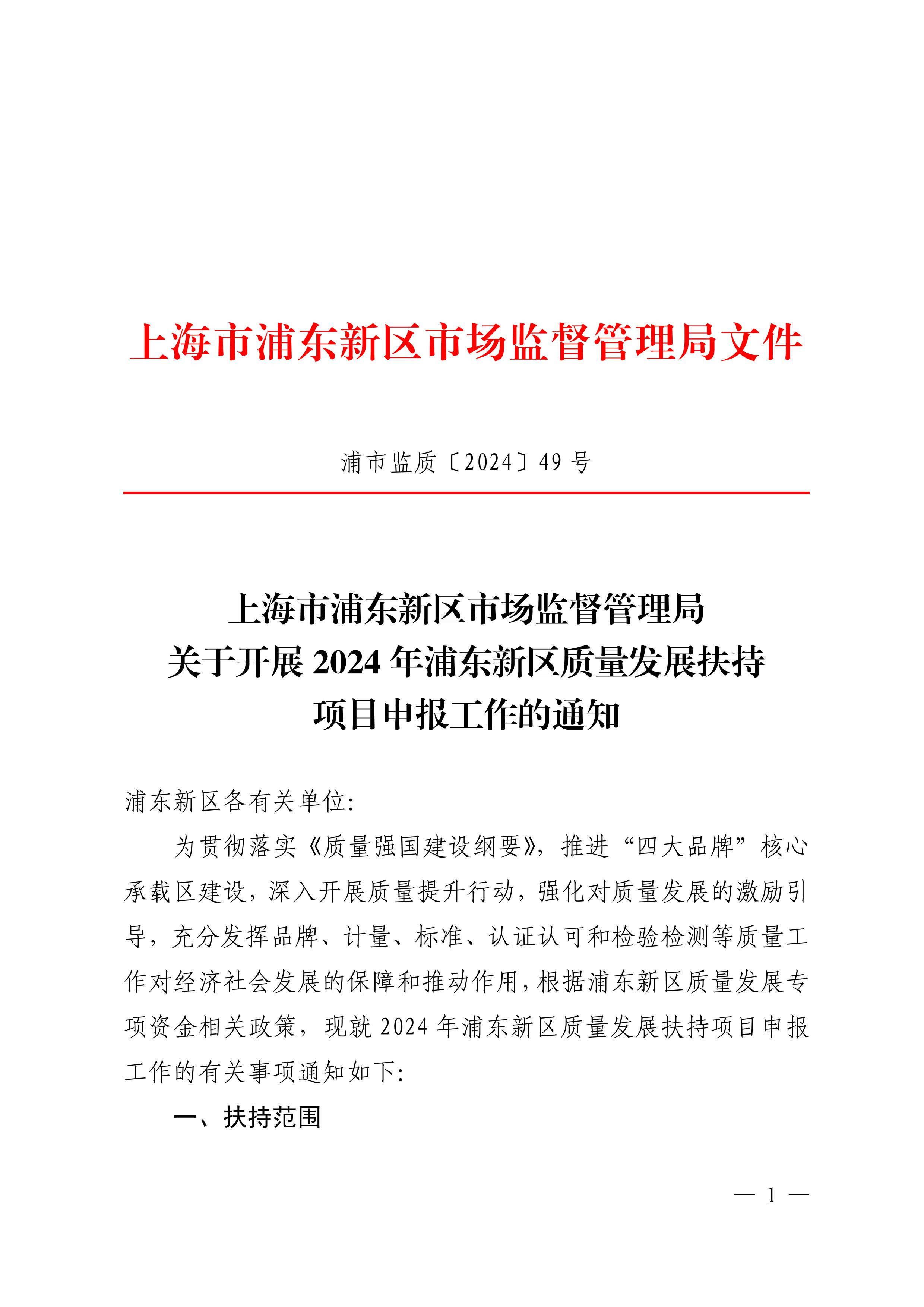 上海市浦东新区市场监督管理局关于开展2024年浦东新区质量发展扶持项目申报工作的通知