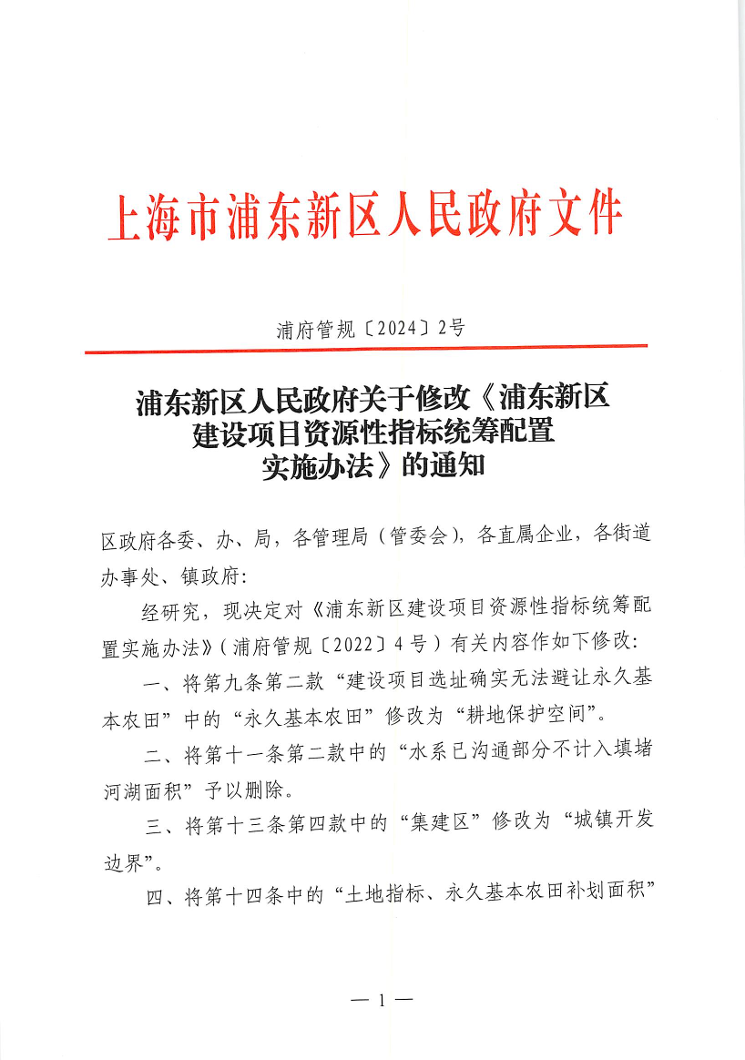 经研究,现决定对《浦东新区建设项目资源性指标统筹配置实施办法》(浦府管规〔2022〕4号)有关内容作如下修改: