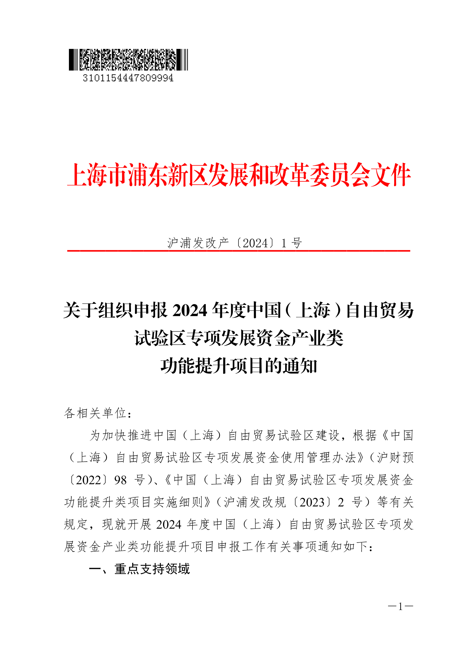为加快推进中国(上海)自由贸易试验区建设,根据《中国(上海)自由贸易试验区专项发展资金使用管理办法》(沪财预〔2022〕98号)、《中国(上海)自由贸易试验区专项发展资金功能提升类项目实施细则》(沪浦发改规〔2023〕2号)等有关规定,现就开展2024年度中国(上海)自由贸易试验区专项发展资金产业类功能提升项目申报工作有关事项通知如下: