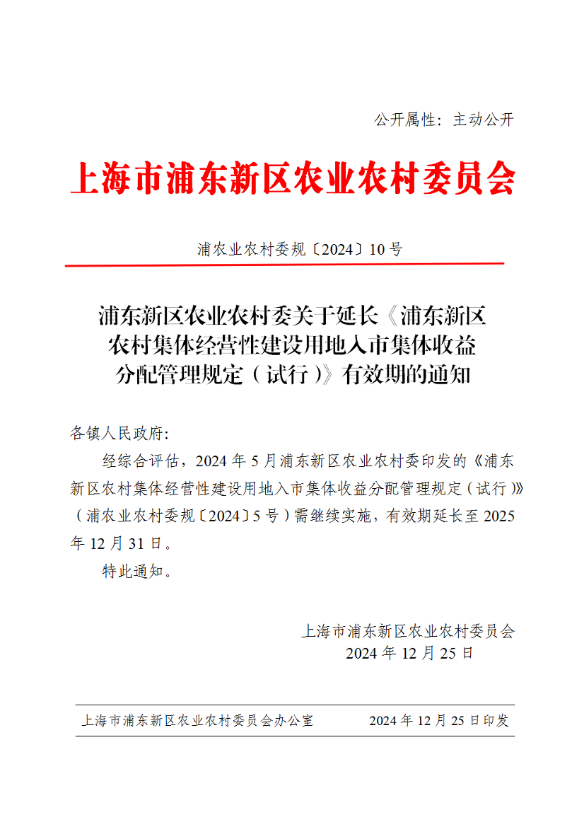 经综合评估,2024年5月浦东新区农业农村委印发的《浦东新区农村集体经营性建设用地入市集体收益分配管理规定(试行)》(浦农业农村委规〔2024〕5号)需继续实施,有效期延长至2025年12月31日。