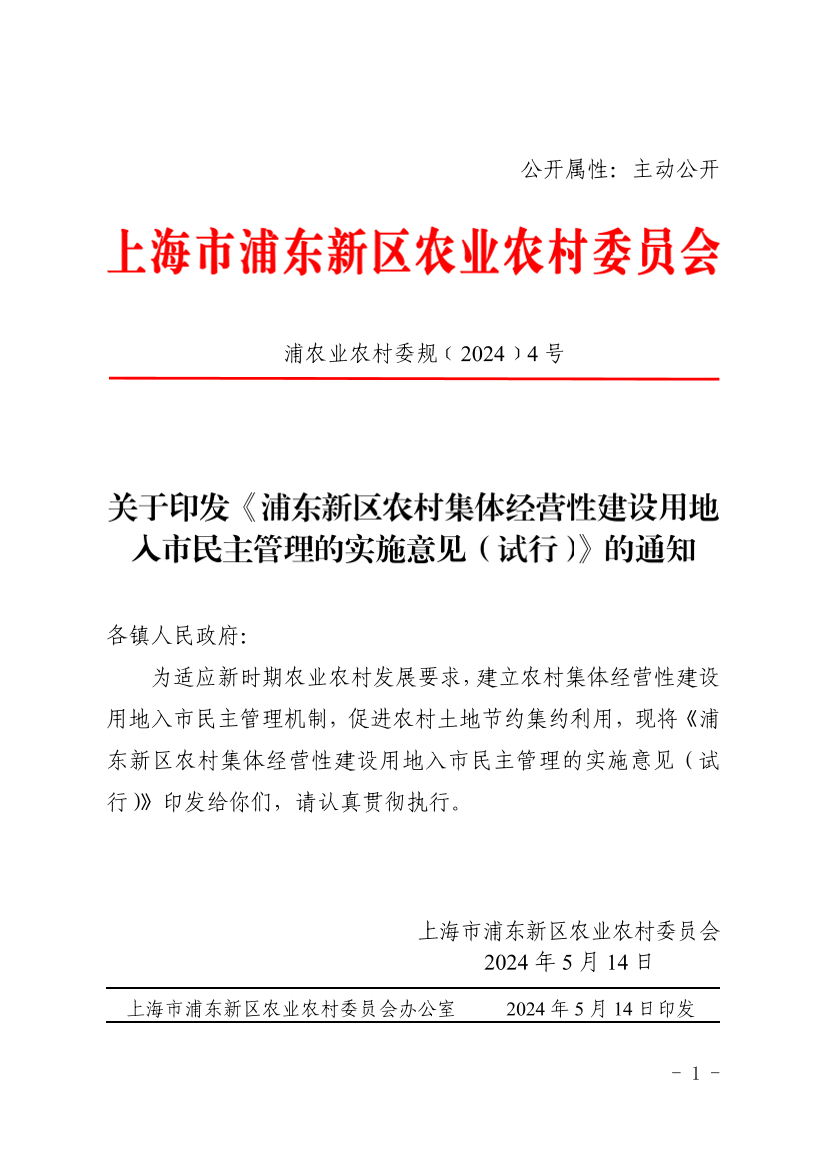 为适应新时期农业农村发展要求,建立农村集体经营性建设用地入市民主管理机制,促进农村土地节约集约利用,现将《浦东新区农村集体经营性建设用地入市民主管理的实施意见(试行)》印发给你们,请认真贯彻执行。