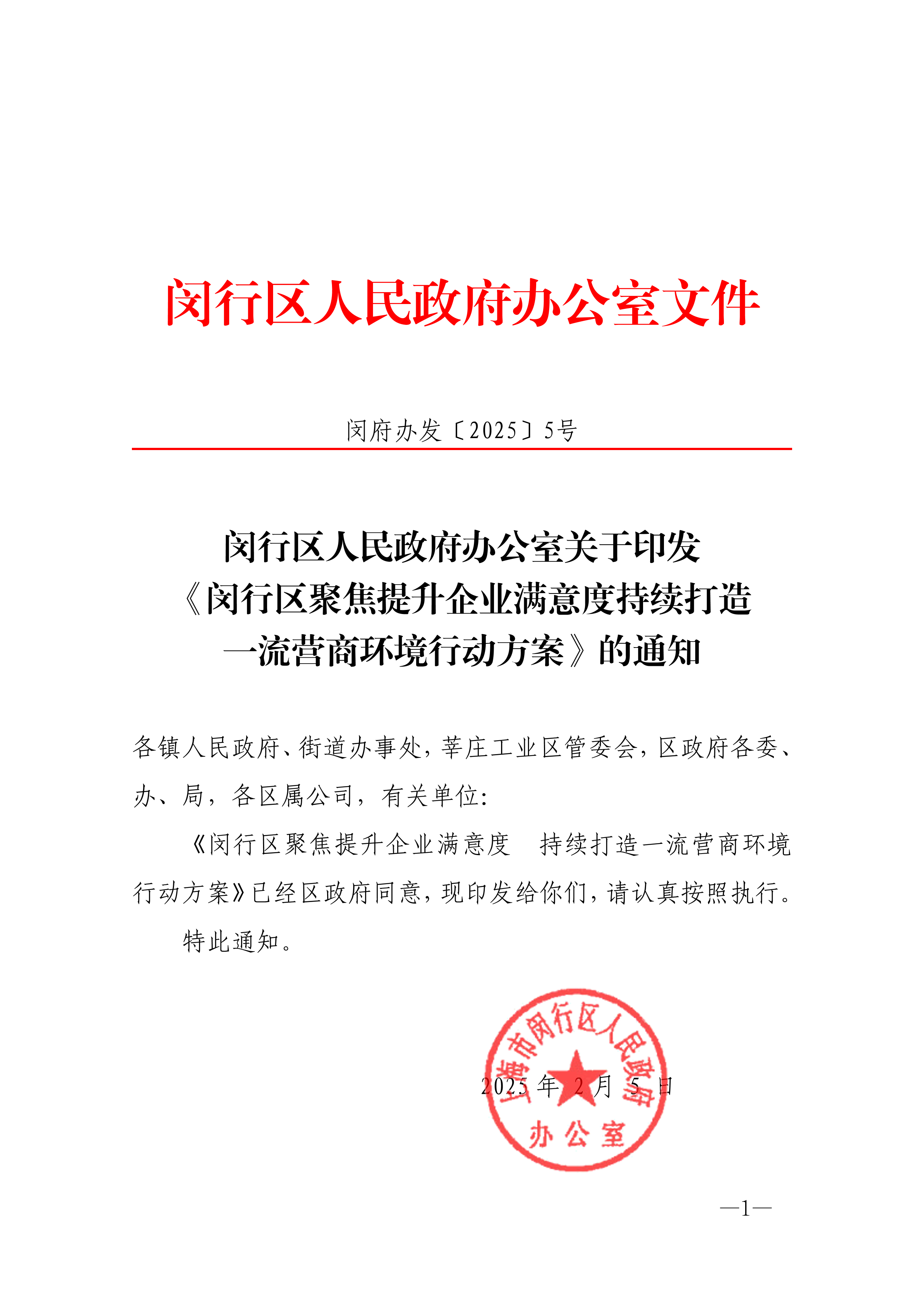 闵行区人民政府办公室关于印发《闵行区聚焦提升企业满意度持续打造一流营商环境行动方案》的通知