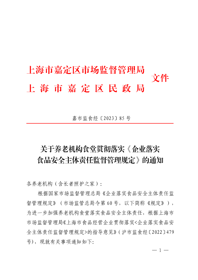 根据国家市场监督管理总局《企业落实食品安全主体责任监督管理规定》(市场监管总局令第60号,以下简称《规定》),为进一步加强养老机构食堂落实食品安全主体责任,根据上海市市场监督管理局《上海市食品经营企业贯彻落实<企业落实食品安全主体责任监督管理规定>的指导意见》(沪市监食经〔2022〕479号),现就有关事项通知如下: