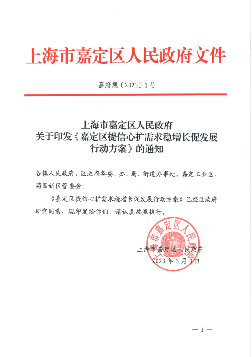 《嘉定区提信心扩需求稳增长促发展行动方案》已经区政府研究同意,现印发给你们,请认真按照执行。