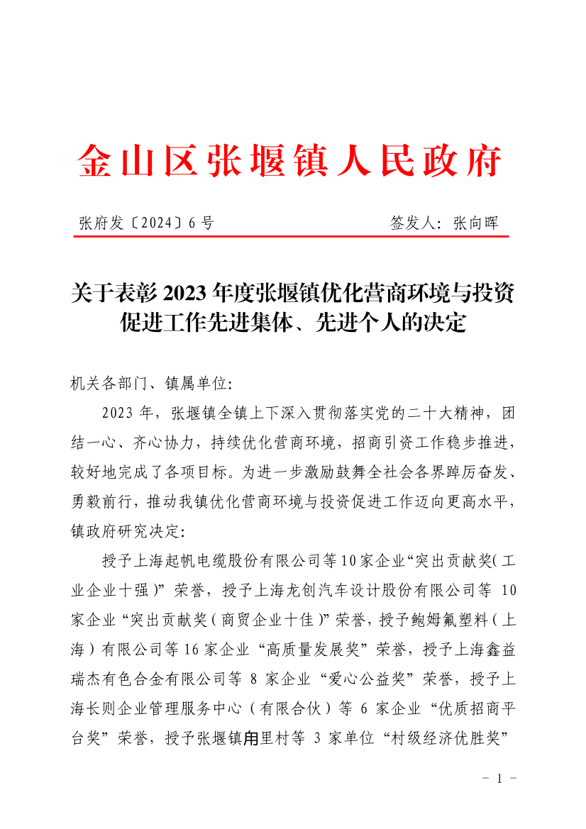授予上海起帆电缆股份有限公司等10家企业“突出贡献奖(工业企业十强)”荣誉,授予上海龙创汽车设计股份有限公司等10家企业“突出贡献奖(商贸企业十佳)”荣誉,授予鲍姆氟塑料(上海)有限公司等16家企业“高质量发展奖”荣誉,授予上海鑫益瑞杰有色合金有限公司等8家企业“爱心公益奖”荣誉,授予上海长则企业管理服务中心(有限合伙)等6家企业“优质招商平台奖”荣誉,授予张堰镇甪里村等3家单位“村级经济优胜奖”荣誉,授予张堰镇市场监督管理所等12家单位“优化营商环境先进集体”荣誉,授予蒋瑛瑛等12位同志“优化营商环境先进个人”荣誉。