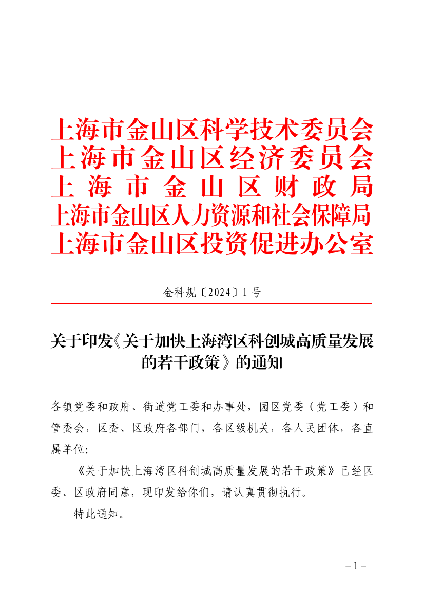 为深入贯彻落实《金山区加快重点区域转型升级着力推动高质量发展实施方案(2023-2025年)》(金委发〔2023〕7号)精神,将上海湾区科创城(以下简称“科创城”)建设成为一座高端人才集聚、高端科研集成、先进成果转化、新兴产业汇聚、金融科技发展、品质生活融合的生态智慧科创城,特制定本政策。