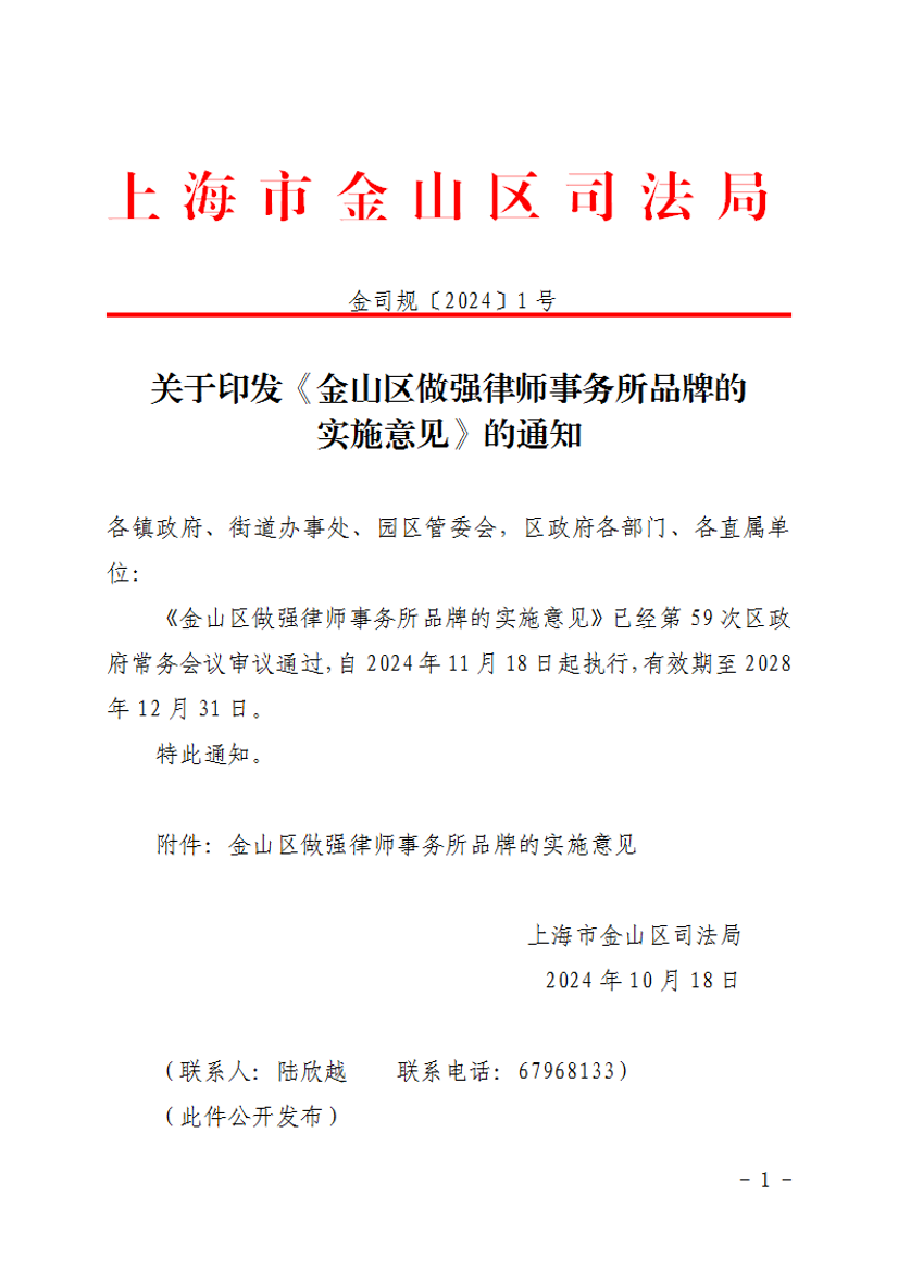 关于印发《金山区做强律师事务所品牌的实施意见》的通知