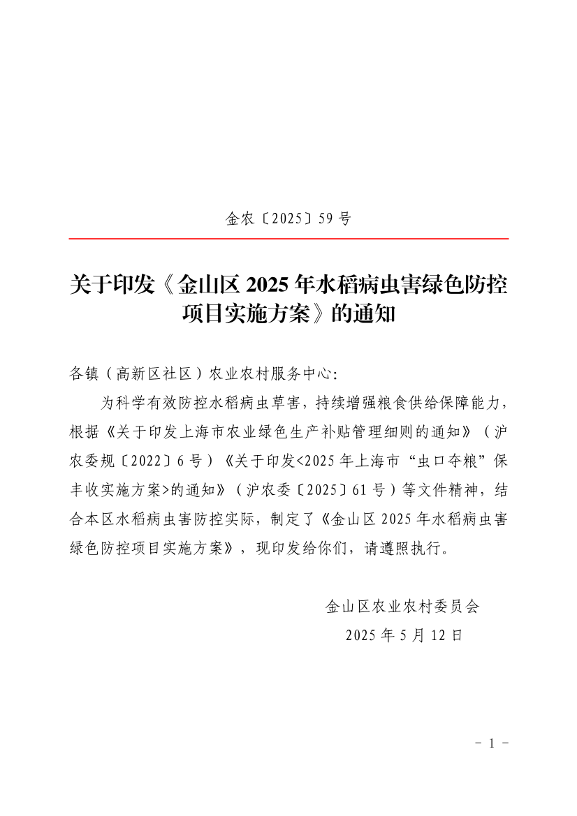 为科学有效防控水稻病虫草害,持续增强粮食供给保障能力,根据《关于印发上海市农业绿色生产补贴管理细则的通知》(沪农委规〔2022〕6号)《关于印发<2025年上海市“虫口夺粮”保丰收实施方案>的通知》(沪农委〔2025〕61号)等文件精神,结合本区水稻病虫害防控实际,制定了《金山区2025年水稻病虫害绿色防控项目实施方案》,现印发给你们,请遵照执行。