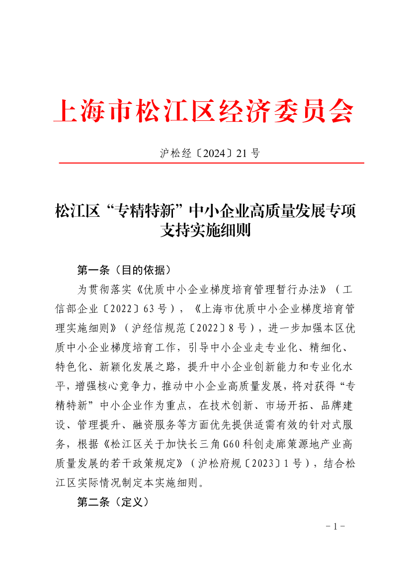 松江区“专精特新”中小企业高质量发展专项支持实施细则