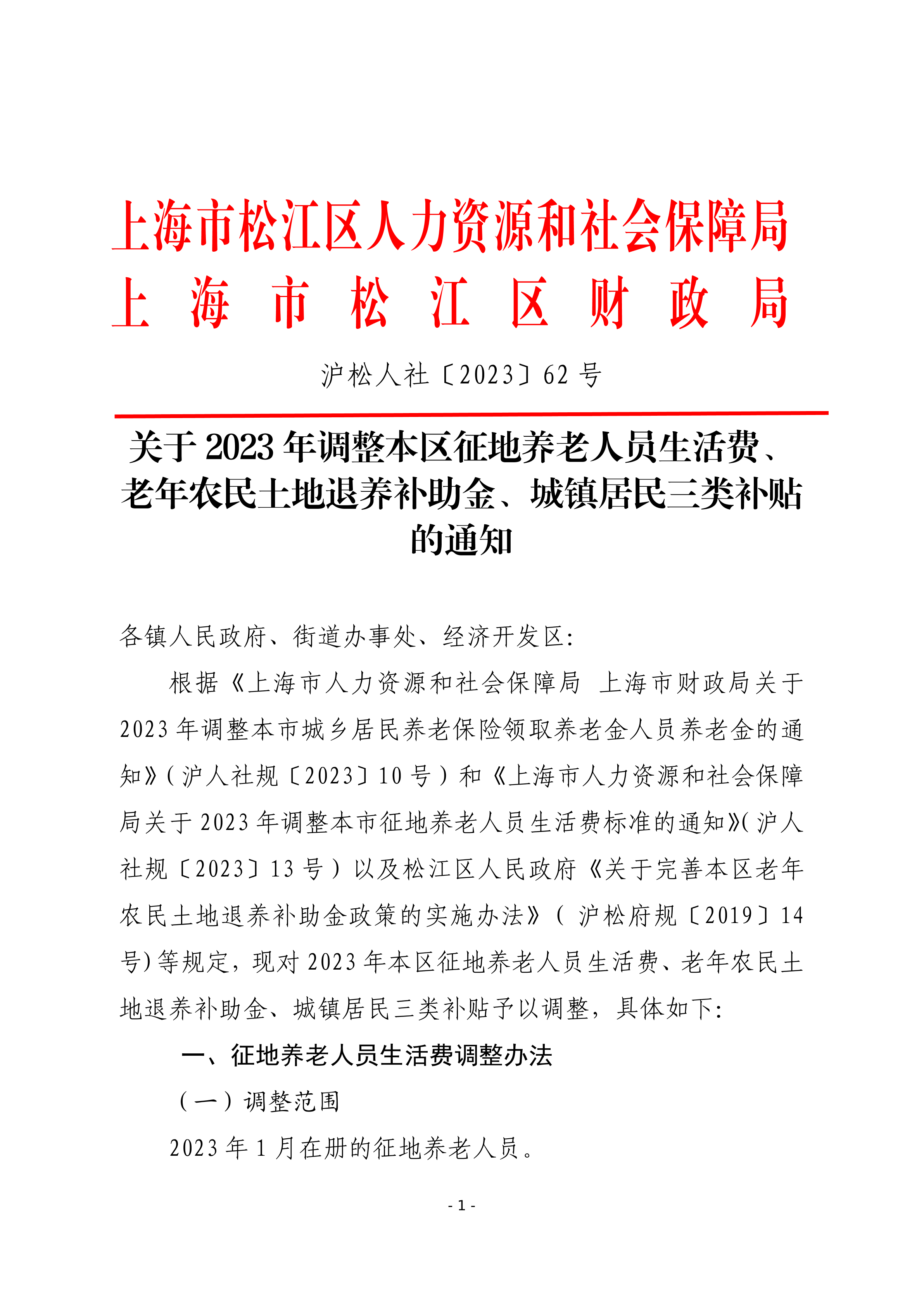 根据《上海市人力资源和社会保障局 上海市财政局关于2023年调整本市城乡居民养老保险领取养老金人员养老金的通知》(沪人社规〔2023〕10号)和《上海市人力资源和社会保障局关于2023年调整本市征地养老人员生活费标准的通知》(沪人社规〔2023〕13号)以及松江区人民政府《关于完善本区老年农民土地退养补助金政策的实施办法》( 沪松府规〔2019〕14号)等规定,现对2023年本区征地养老人员生活费、老年农民土地退养补助金、城镇居民三类补贴予以调整,具体如下: