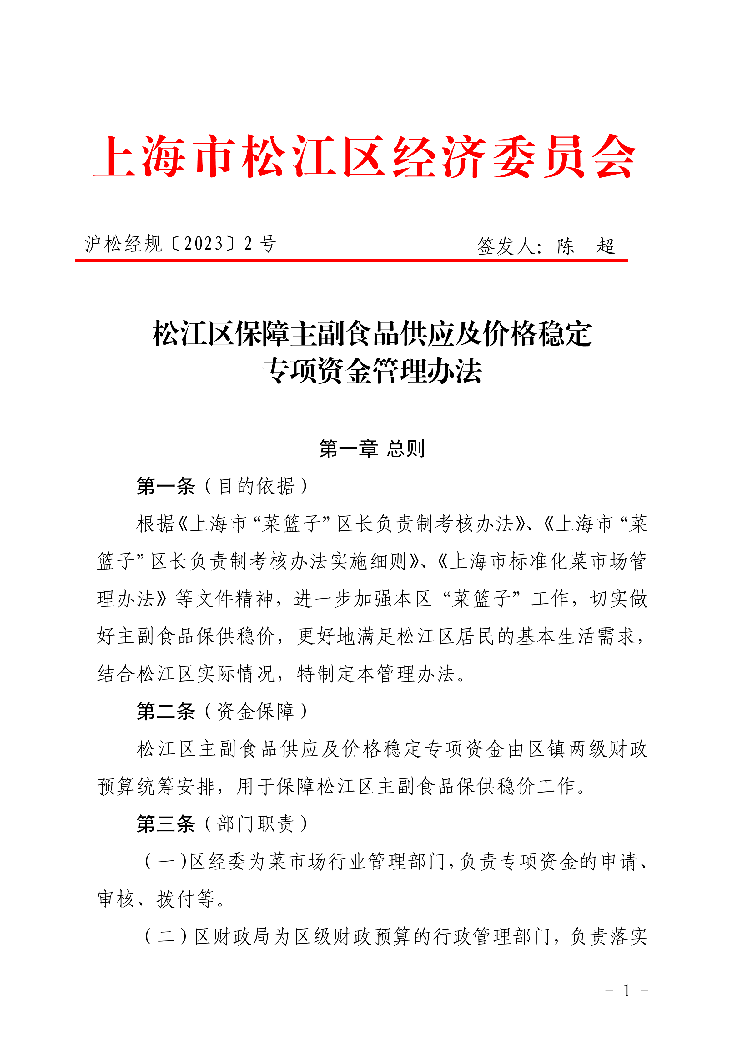 松江区保障主副食品供应及价格稳定专项资金管理办法