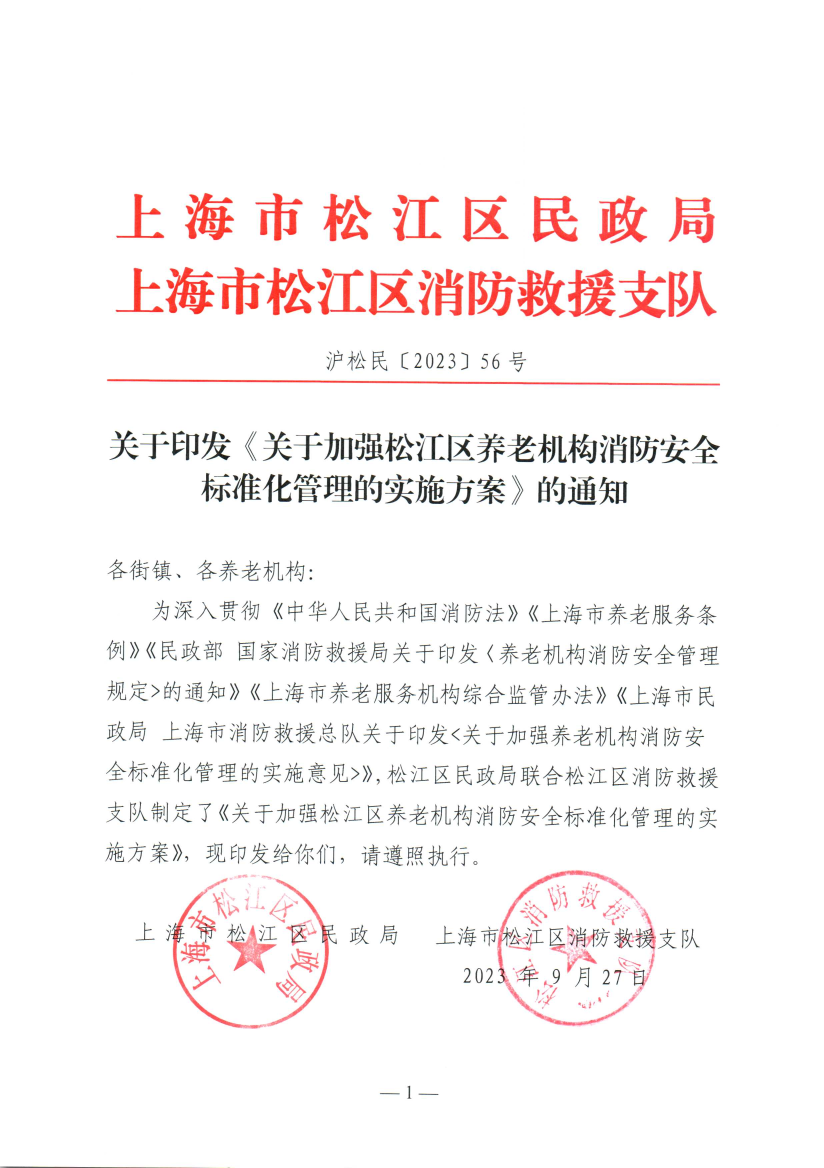 关于印发《关于加强松江区养老机构消防安全标准化管理的实施方案》的通知
