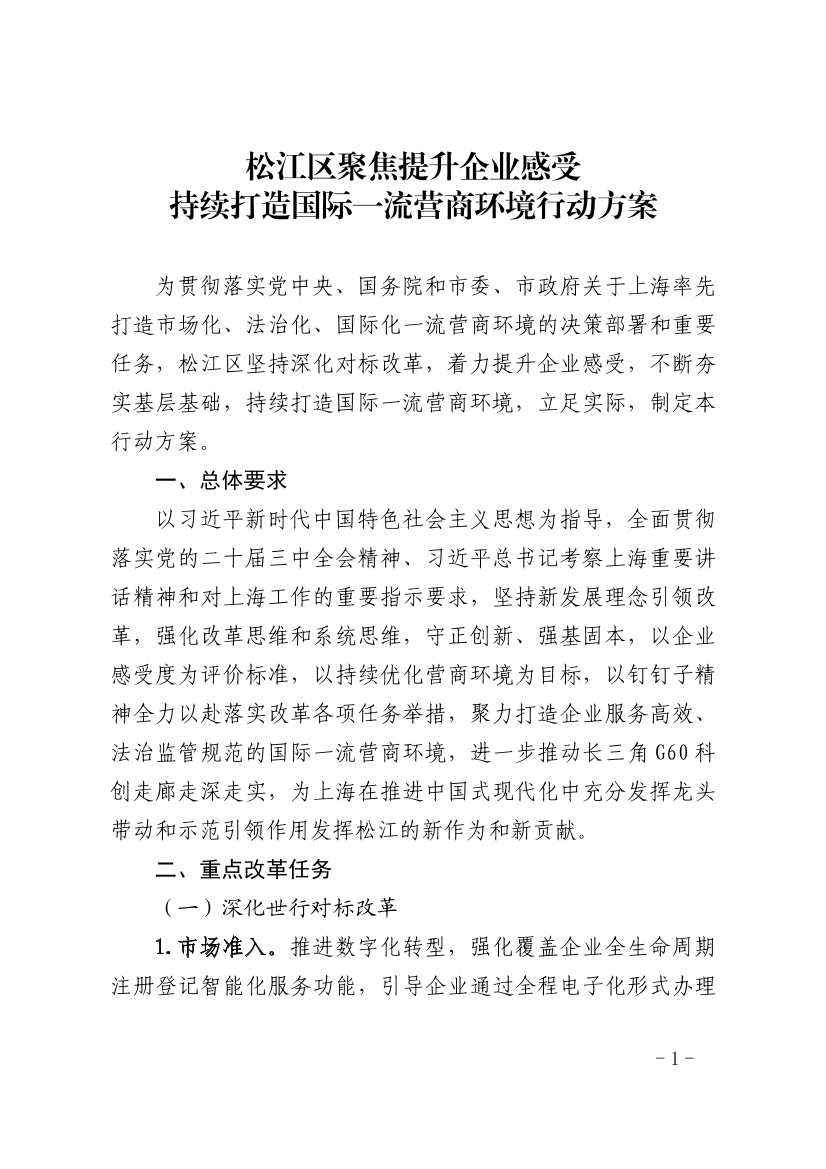 为贯彻落实党中央、国务院和市委、市政府关于上海率先打造市场化、法治化、国际化一流营商环境的决策部署和重要任务,松江区坚持深化对标改革,着力提升企业感受,不断夯实基层基础,持续打造国际一流营商环境,立足实际,制定本行动方案。