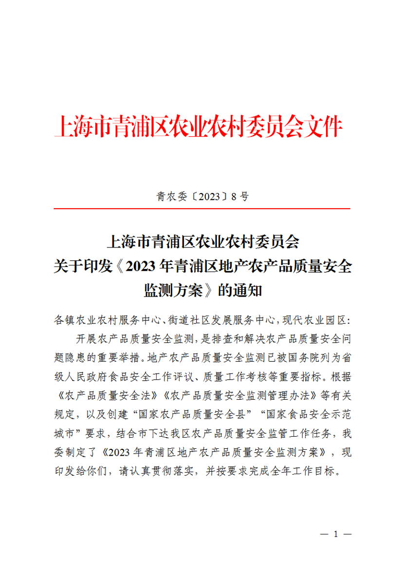 开展农产品质量安全监测,是排查和解决农产品质量安全问题隐患的重要举措。地产农产品质量安全监测已被国务院列为省级人民政府食品安全工作评议、质量工作考核等重要指标。根据《农产品质量安全法》《农产品质量安全监测管理办法》等有关规定,以及创建“国家农产品质量安全县”“国家食品安全示范城市”要求,结合市下达我区农产品质量安全监管工作任务,我委制定了《2023年青浦区地产农产品质量安全监测方案》,现印发给你们,请认真贯彻落实,并按要求完成全年工作目标。