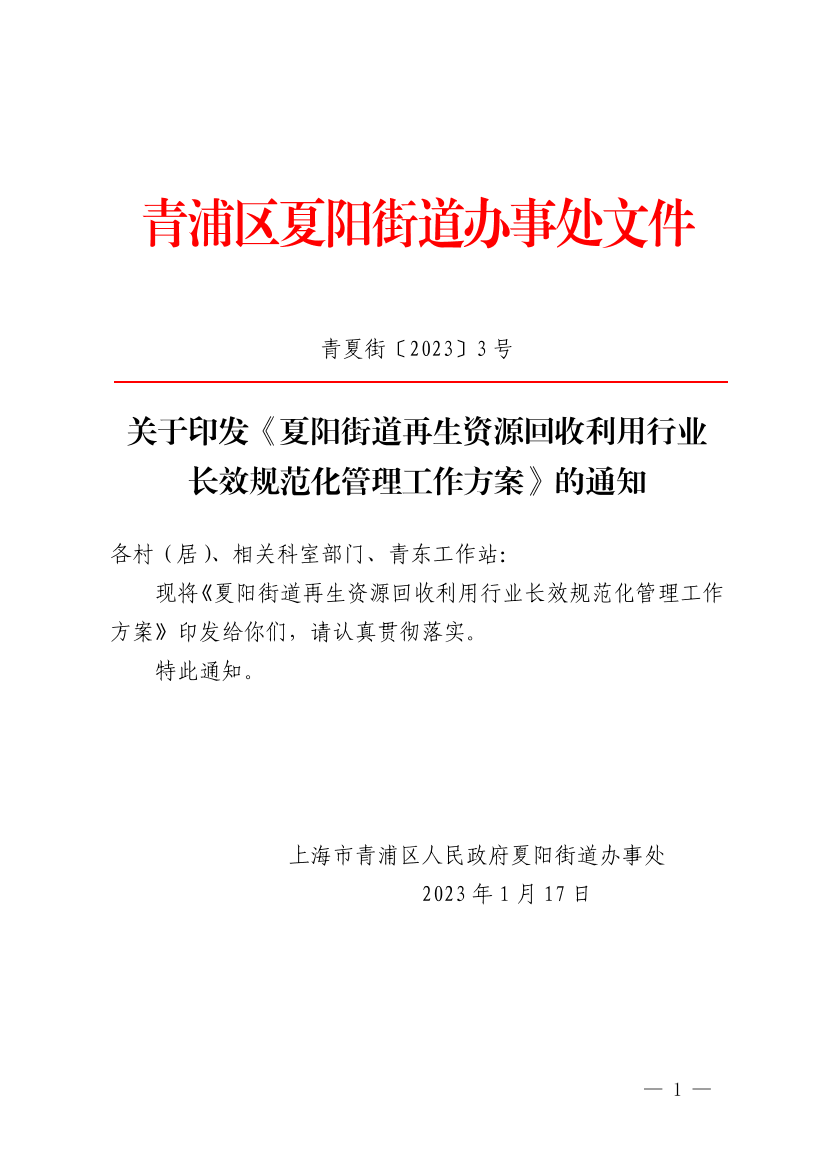 现将《夏阳街道再生资源回收利用行业长效规范化管理工作方案》印发给你们,请认真贯彻落实。