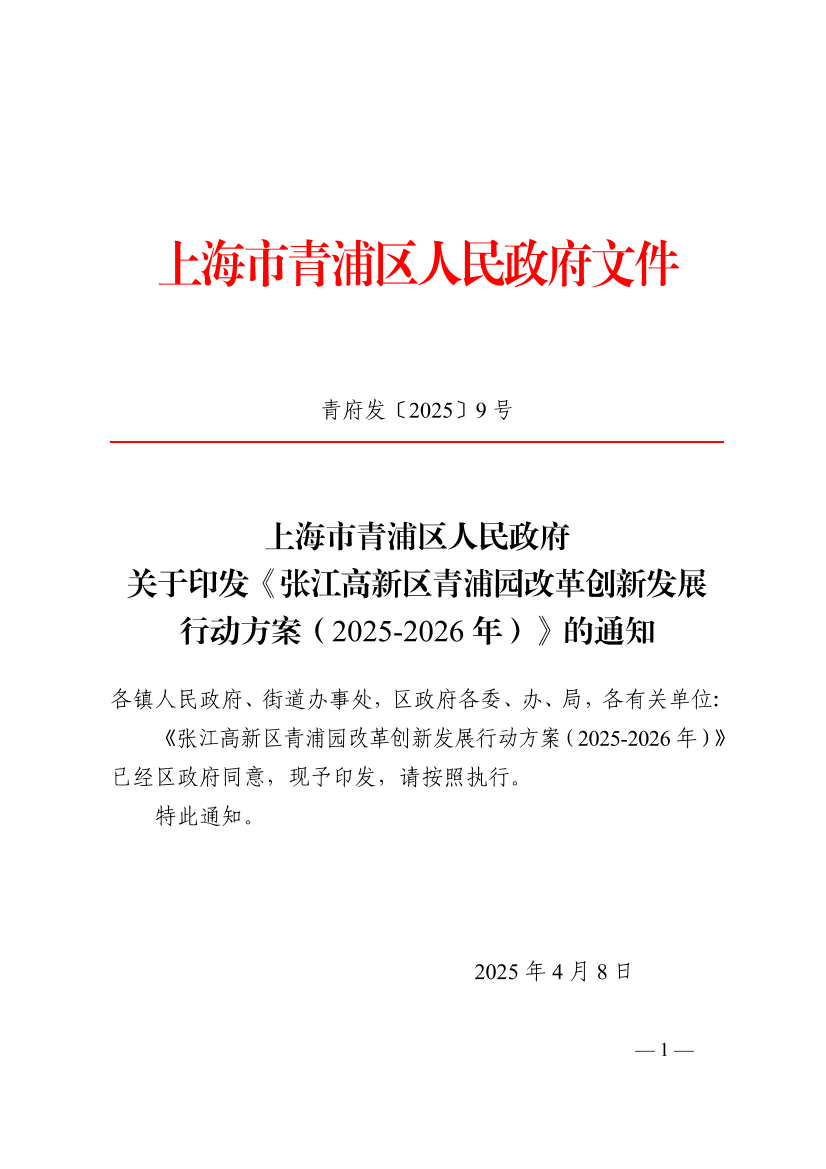 《张江高新区青浦园改革创新发展行动方案(2025-2026年)》已经区政府同意,现予印发,请按照执行。
