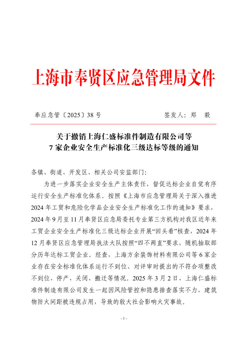 根据国家应急管理部《企业安全生产标准化建设定级办法》(应急〔2021〕83号)和《奉贤四团上海仁盛标准件制造有限公司“3·2”一般火灾事故调查报告》,现决定撤销上海仁盛标准件制造有限公司等7家企业(详见附件)安全生产标准化三级达标等级。请各地区(公司)安监部门及时告知被撤销达标等级的企业,督促其深刻吸取教训,严格对照安全生产标准化评审要求,查漏补缺、对表整改,强化企业安全隐患排查治理,落实企业主体责任,进一步提升企业安全生产管理水平,确保安全生产。
