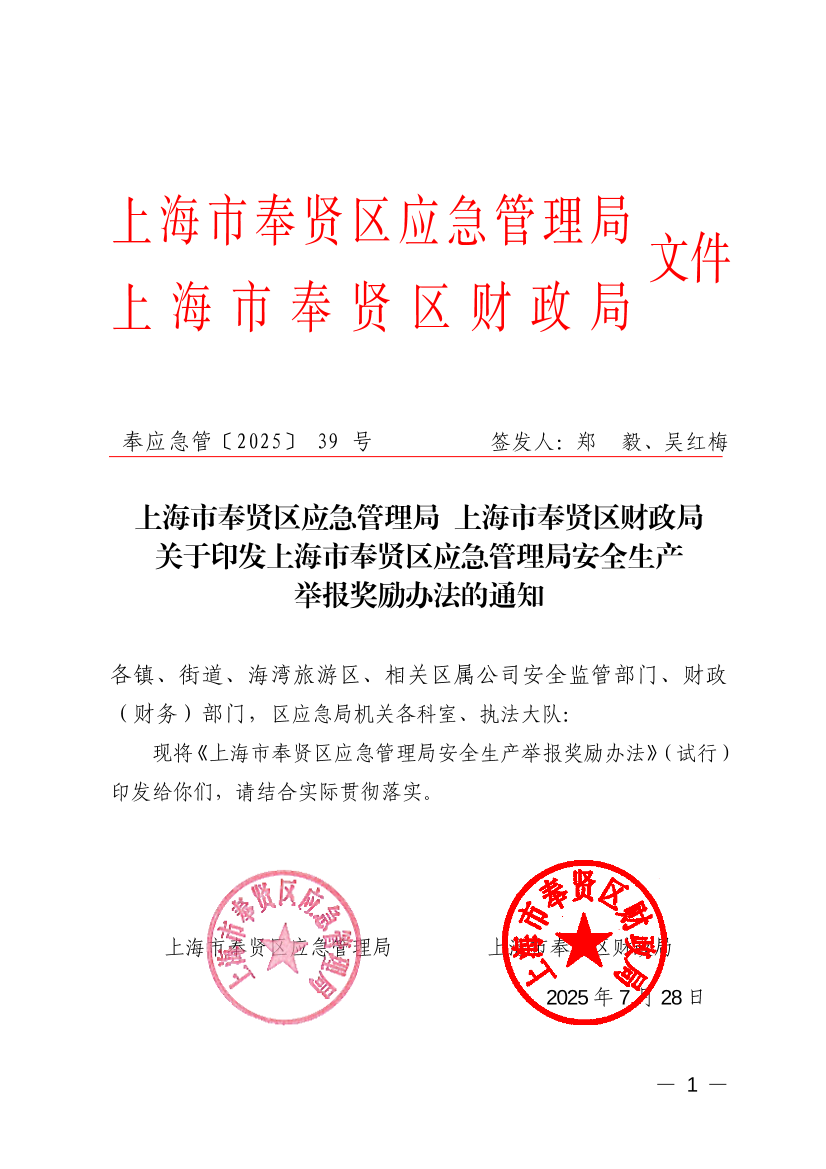 上海市奉贤区应急管理局安全生产举报奖励办法(试行)