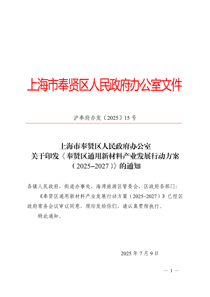 《奉贤区通用新材料产业发展行动方案(2025-2027)》已经区政府常务会议审议同意,现印发给你们,请认真贯彻执行。