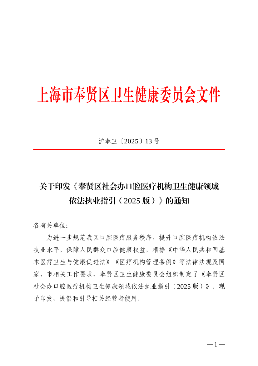 为进一步规范我区口腔医疗服务秩序,提升口腔医疗机构依法执业水平,保障人民群众口腔健康权益,根据《中华人民共和国基本医疗卫生与健康促进法》《医疗机构管理条例》等法律法规及国家、市相关工作要求,奉贤区卫生健康委员会组织制定了《奉贤区社会办口腔医疗机构卫生健康领域依法执业指引(2025版)》。现予印发,提倡和引导相关经营者使用。