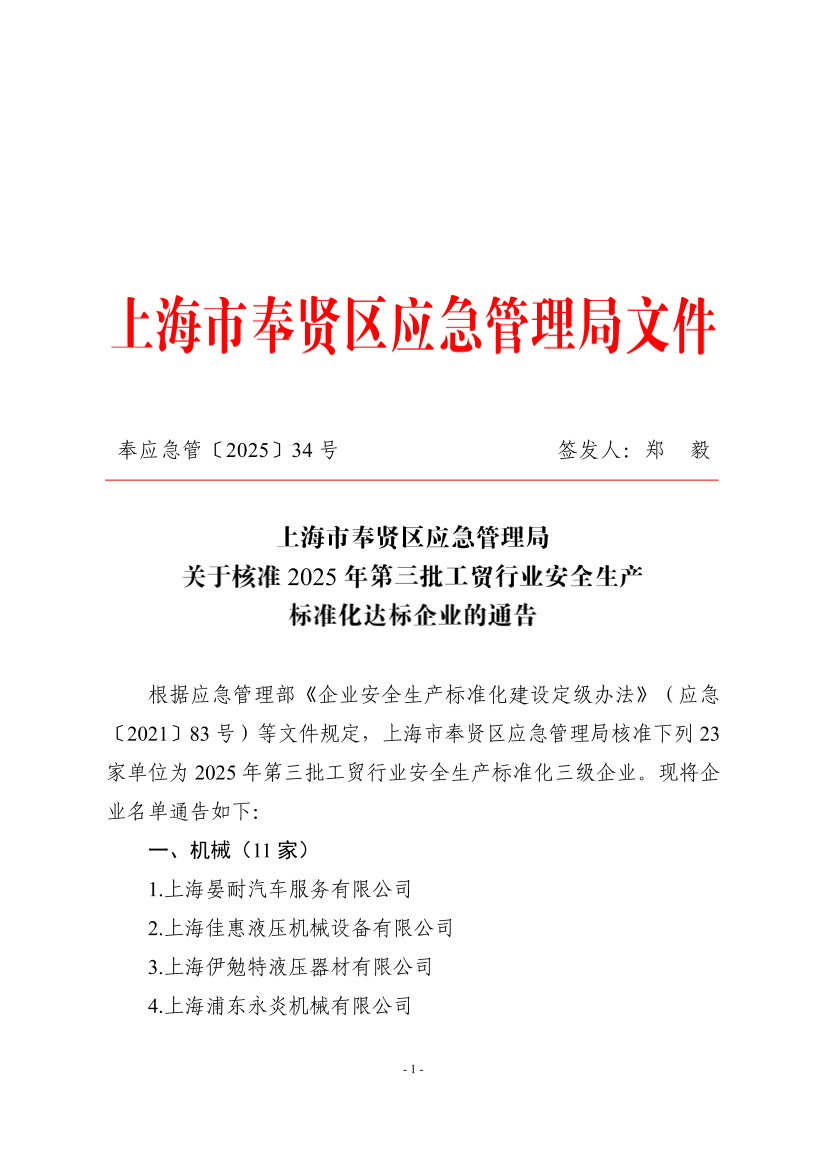 根据应急管理部《企业安全生产标准化建设定级办法》(应急〔2021〕83号)等文件规定,上海市奉贤区应急管理局核准下列23家单位为2025年第三批工贸行业安全生产标准化三级企业。现将企业名单通告如下: