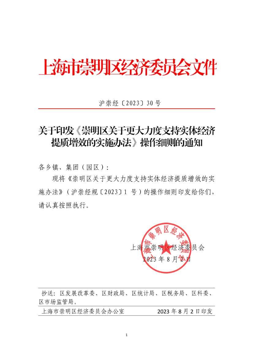 关于印发《崇明区关于更大力度支持实体经济提质增效的实施办法》操作细则的通知