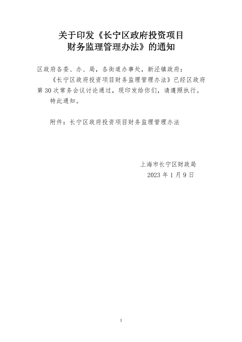 关于印发《长宁区政府投资项目财务监理管理办法》的通知