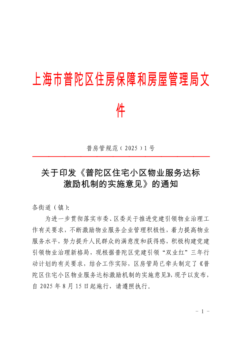 为进一步贯彻落实市委、区委关于推进党建引领物业治理工作有关要求,不断激励物业服务企业管理积极性,着力提高物业服务水平,努力提升人民群众的满意度和获得感,积极构建党建引领物业治理新格局,现根据普陀区党建引领“双业红”三年行动计划的有关要求,结合工作实际,区房管局已牵头制定了《普陀区住宅小区物业服务达标激励机制的实施意见》,现予以发布,自2025年8月15日起施行,请遵照执行。