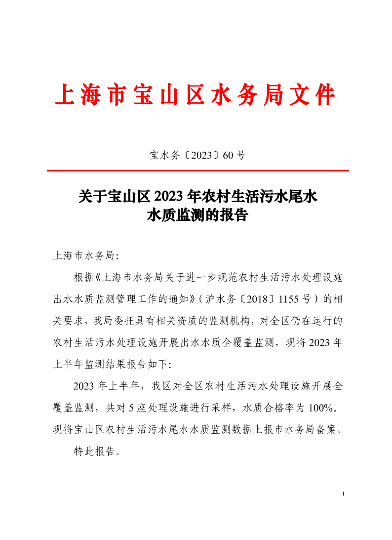 根据《上海市水务局关于进一步规范农村生活污水处理设施出水水质监测管理工作的通知》(沪水务〔2018〕1155号)的相关要求,我局委托具有相关资质的监测机构,对全区仍在运行的农村生活污水处理设施开展出水水质全覆盖监测,现将2023年上半年监测结果报告如下: