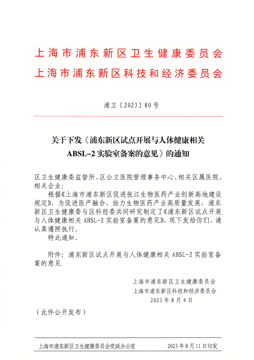 关于下发《浦东新区试点开展与人体健康相关ABSL-2实验室备案的意见》的通知