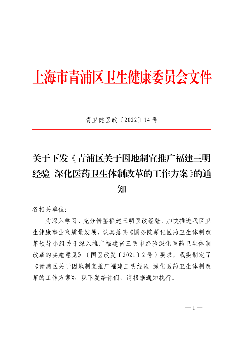 为深入学习、充分借鉴福建三明医改经验,加快推进我区卫生健康事业高质量发展,认真落实《国务院深化医药卫生体制改革领导小组关于深入推广福建省三明市经验深化医药卫生体制改革的实施意见》(国医改发〔2021〕2 号)要求,我委制定了《青浦区关于因地制宜推广福建三明经验深化医药卫生体制改革的工作方案》,现下发给你们,请根据通知执行。