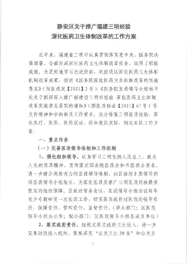 根据国家和市医改工作的部署和要求,为深入学习借鉴福建三明医改经验,进一步深化本区医改工作,现将《静安区关于推广福建三明经验深化医药卫生体制改革的工作方案》印发给你们,请认真贯彻执行。