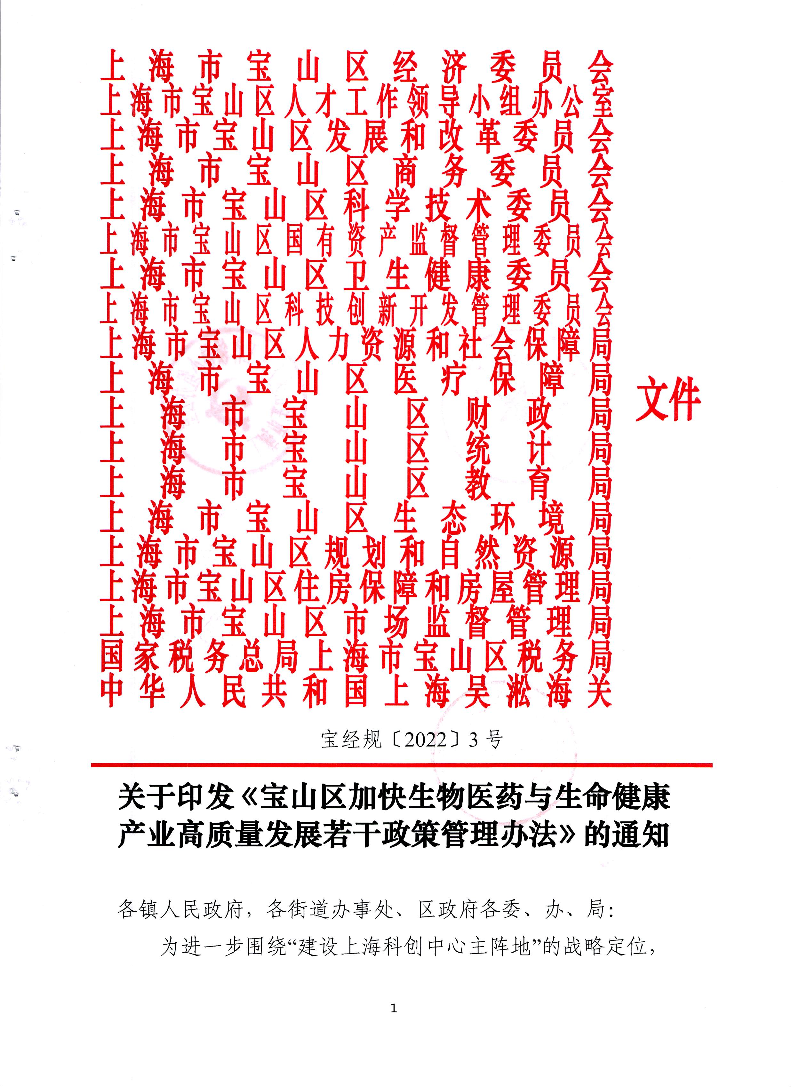 宝山区加快生物医药与生命健康产业高质量发展若干政策管理办法