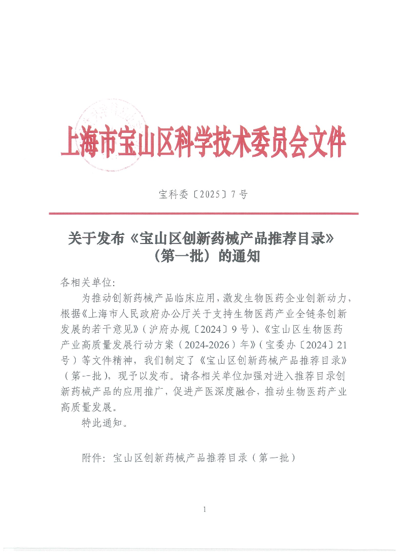 为推动创新药械产品临床应用,激发生物医药企业创新动力,根据《上海市人民政府办公厅关于支持生物医药产业全链条创新发展的若干意见》(沪府办规〔2024〕9号)、《宝山区生物医药产业高质量发展行动方案(2024-2026)年》(宝委办〔2024〕21号)等文件精神,我们制定了《宝山区创新药械产品推荐目录》(第一批),现予以发布。请各相关单位加强对进入推荐目录创新药械产品的应用推广,促进产医深度融合,推动生物医药产业高质量发展。