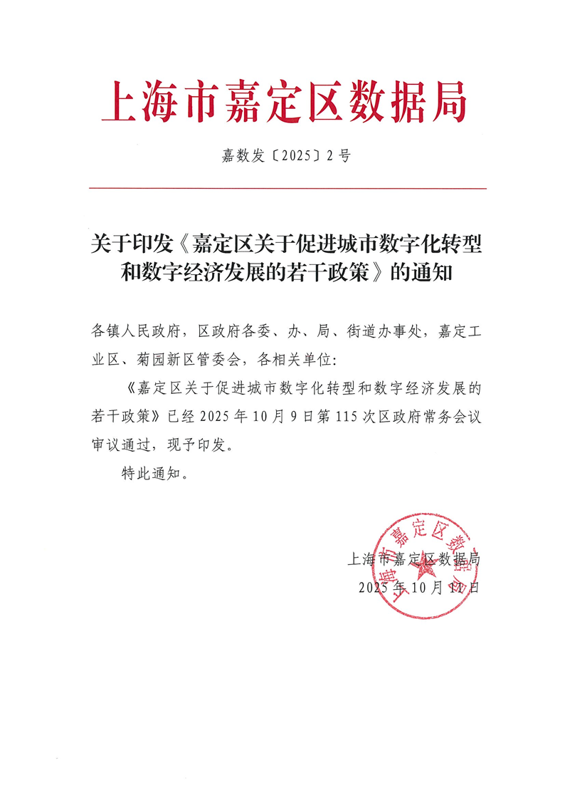 《嘉定区关于促进城市数字化转型和数字经济发展的若干政策》已经2025年10月9日第115次区政府常务会议审议通过,现予印发。