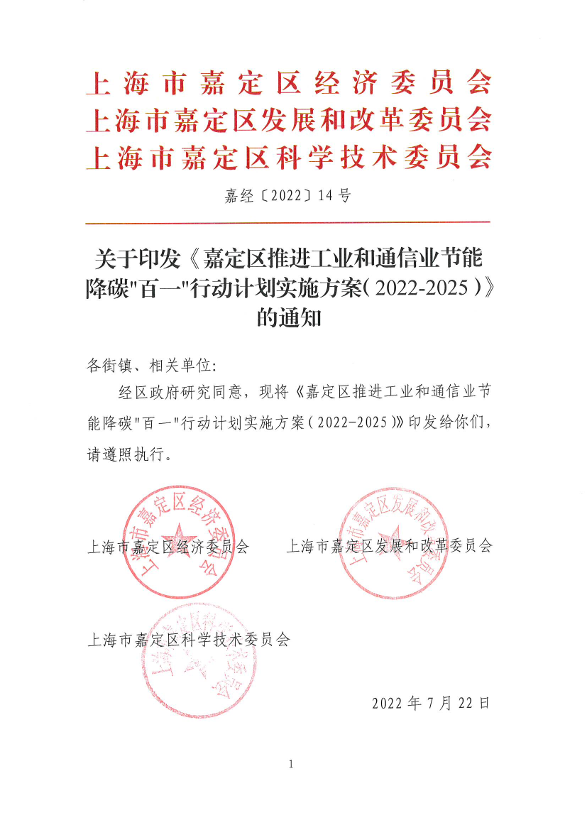 关于印发《嘉定区推进工业和通信业节能降碳"百一"行动计划实施方案(2022-2025)》的通知